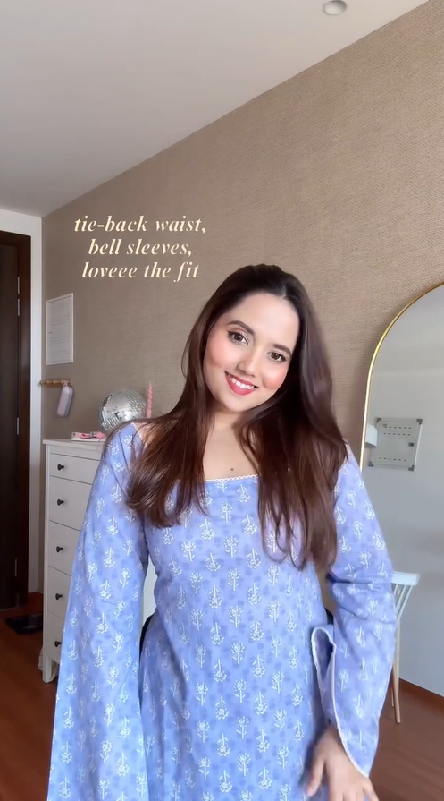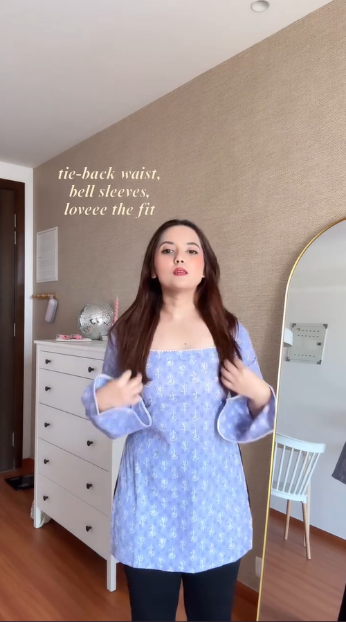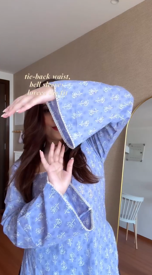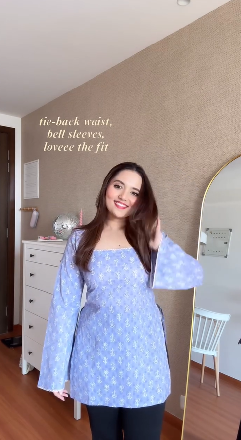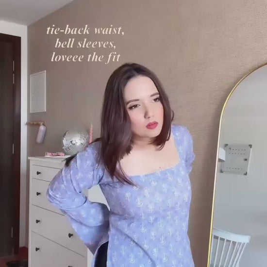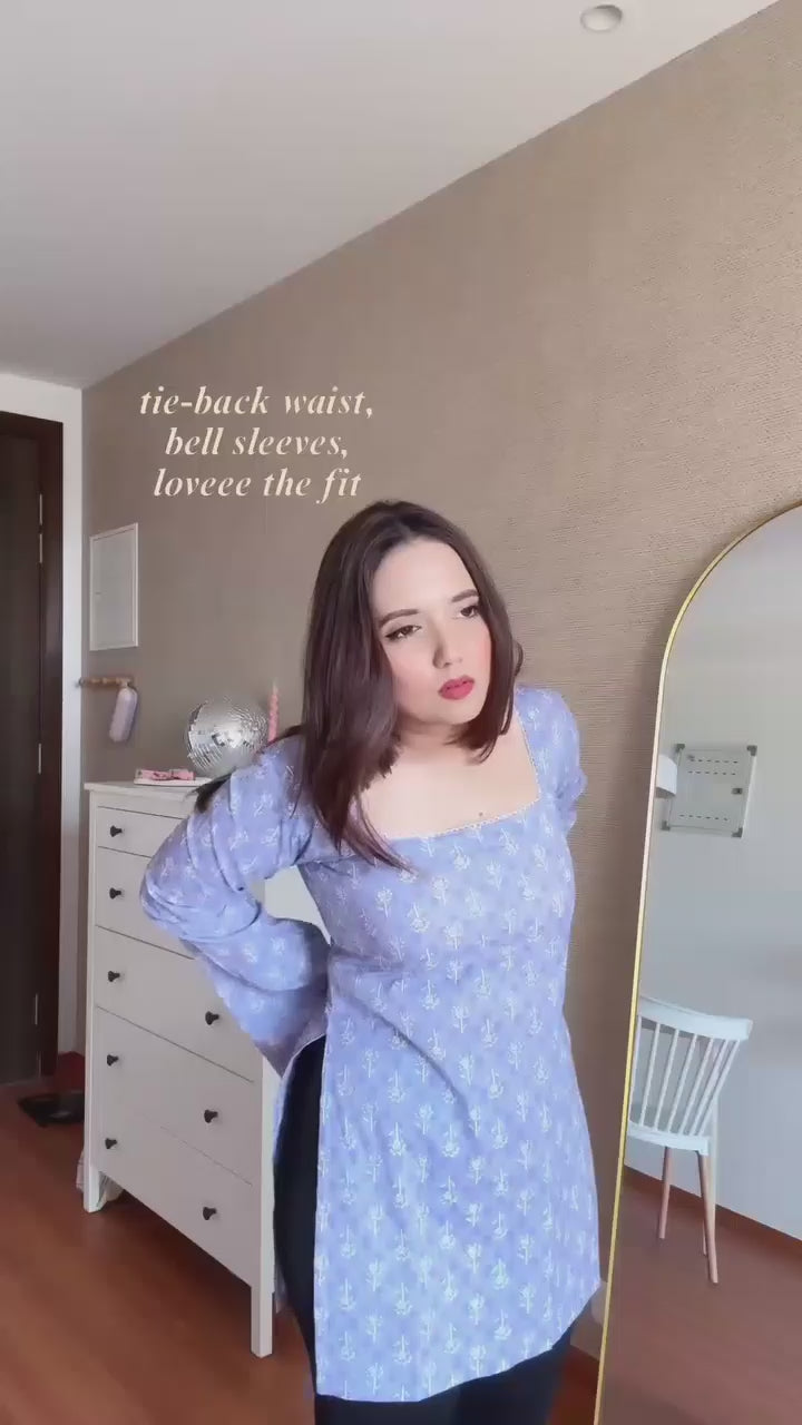 A chic dusty-pink floral printed long top featuring a flattering square neckline, flowy bell sleeves, and an adjustable upper-back tie-up for a perfect fit.